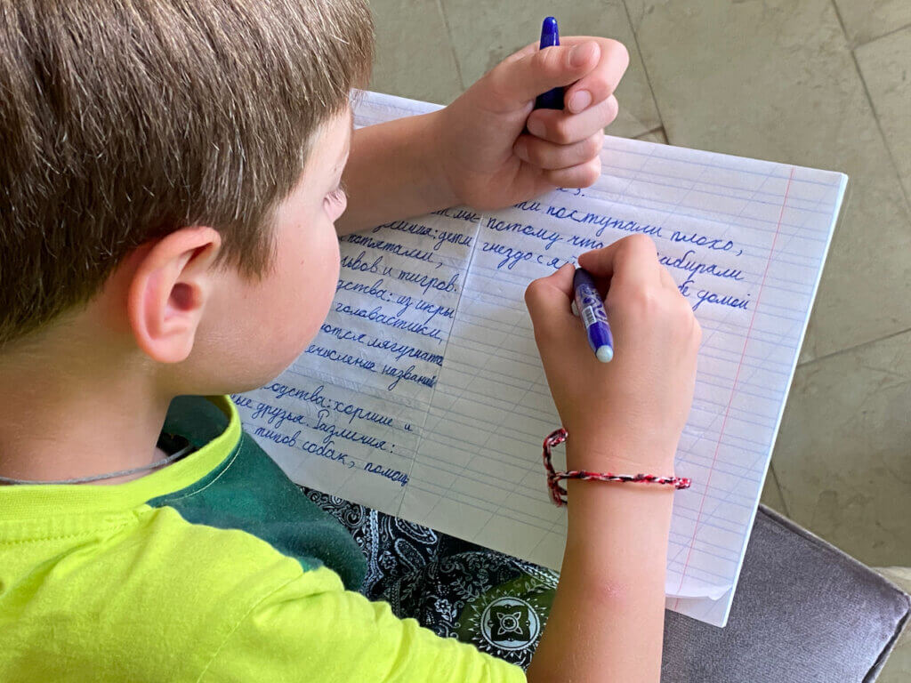 Лично мы столкнулись с такими трудностями как большие объёмы писанины и правильность оформления работ, особенно по математике. Также в Нидерландах немного по другому пишут некоторые цифры и сын два года практиковал такое написание. Максим порой категорически отказывался писать прописи по русскому языку. В ход шли уговоры, поощрения и прочее. Не обходилось и без слез и истерик. Все было. Но тем не менее все работы были выполнены. Я не сторонница делать минимум. Мы делали полный объём, порой по русскому даже больше чем надо.