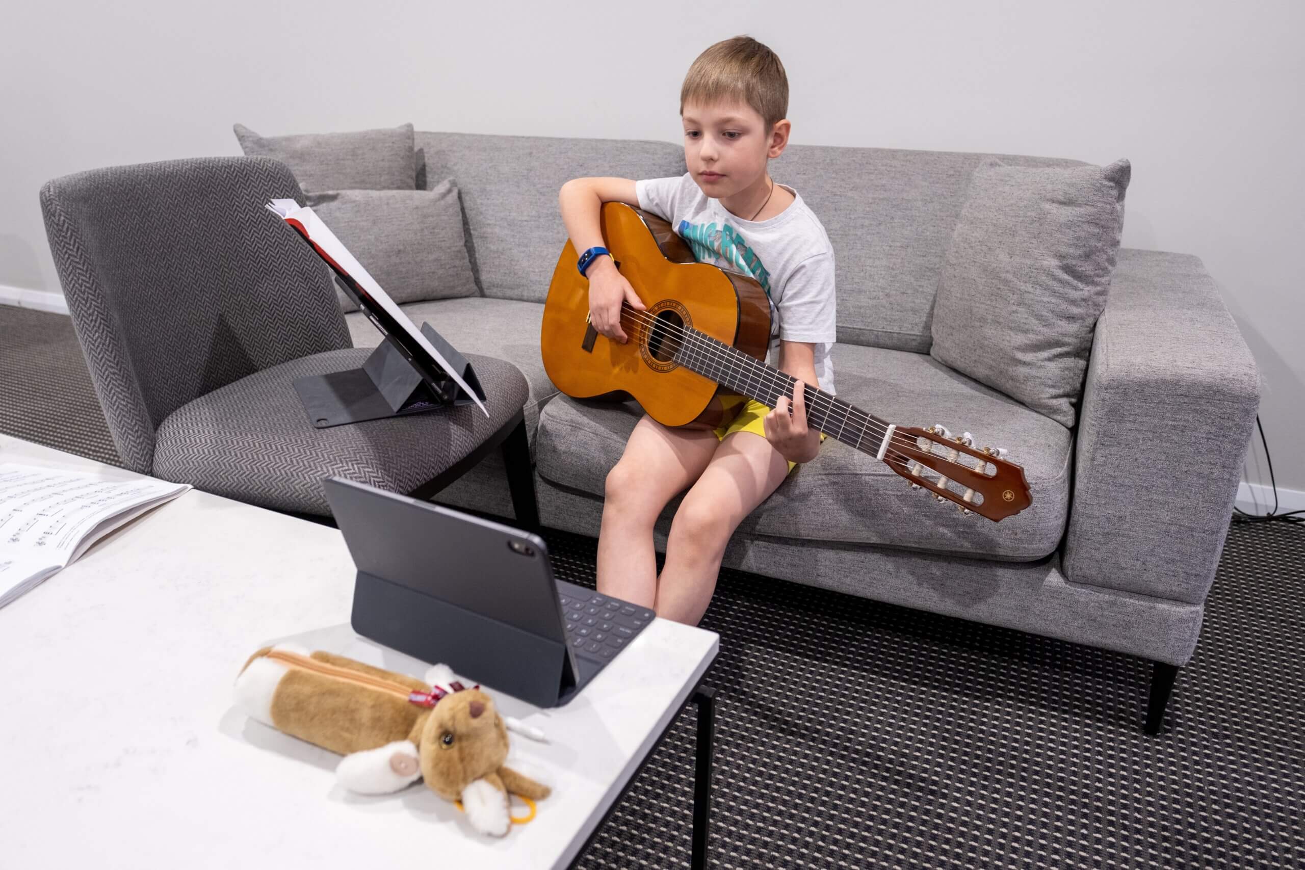 Помимо школы у Максима раз в неделю урок английского и гитары, и все это онлайн. Английский с преподавателем из России, а гитару преподаёт учитель из Нидерландов. Еще живя в Амстердаме Максим год ходил на офлайн уроки гитары, ему очень нравилось. Мы решили пойти ему на встречу и продолжить уроки онлайн. Гитару бывает сложно перевозить, но тем не менее она пока с нами).