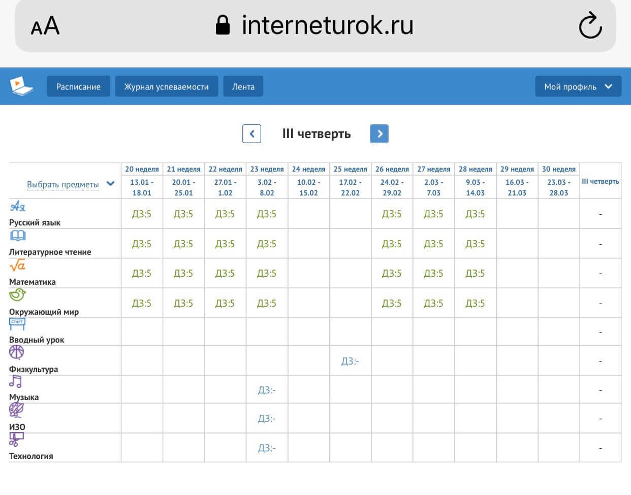 Хочу отметить, что есть сроки выполнения ДЗ, они прописаны для каждой четверти. Если не сдать вовремя, то либо будет 2 за четверть, либо могут предложить платную аттестацию по этому предмету. Но тем не менее есть индивидуальный подход. Если вам это не подходит, то все можно решить индивидуально. Поскольку мы второй класс начинаем проходить со второго полугодия, то сроков по ДЗ у нас нет. Вот такой приятный бонус.