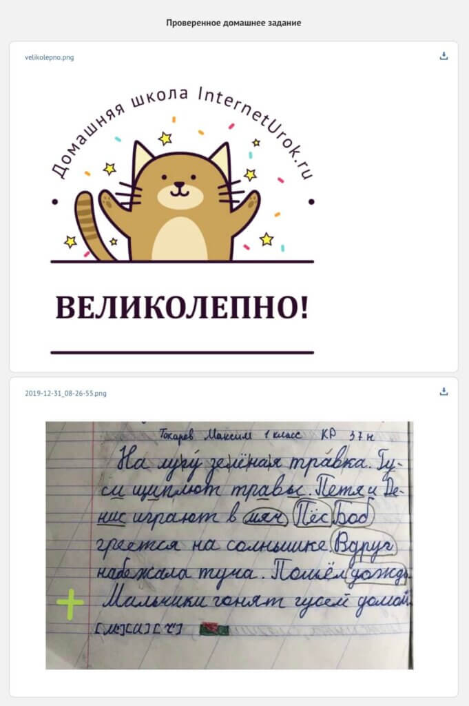 В начале января 2020 года мы загрузили последние работы. Когда их проверили, то мы запросили аттестацию для перевода во второй класс. Вот тут и выходит на первый план школа в которую мы зачислены. В 1-2 классах аттестация у нас бесплатная. Присылают задания по основным предметам: русский язык, чтение, математика и окружающий мир. Время выполнения 1 месяц. Мы справились за пару дней с учетом того, что сначала выполняли на черновике, а потом переписывали на чистовую. Опять же, лично для меня было важно чтобы сын сам все сделал без моей подсказки, важно на сколько он усвоил материал первого класса.